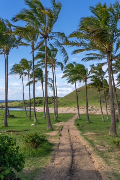 Anakena Beach is the largest and most popular beach to visit. It’s surrounded by palm trees and has a scenic path down to the sand. And of course, has the Moai statues next to it too. There’s also a little beach bar near the entrance where you can have a drink and relax.